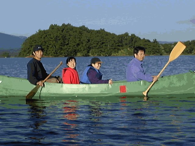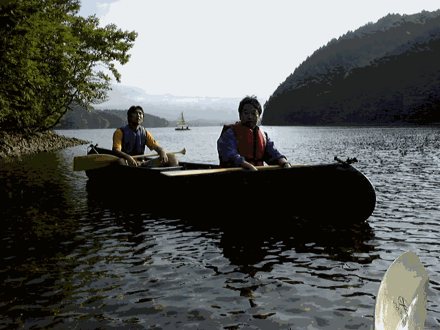 | 街中で暮らしていると、電気がなくなった日のことを思うだけで生きた心地がしないのに、いざ俗世を一歩離れると遊び方は無数にあり、電気なんぞ要らなく思えてしまう。とはいえ、1年中キャンプ暮らしを強いられると拒否するんだけど。 唐突ですが、ここで問題です。Yasのカヌーは何人乗りでしょう。 正解は4人です。でも、男4人だときっと沈むでしょう。いやはや、下の写真を見ると、男2人・女2人でも水位線がかなりあがってます。 |