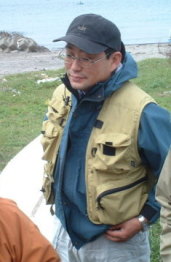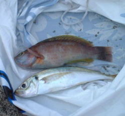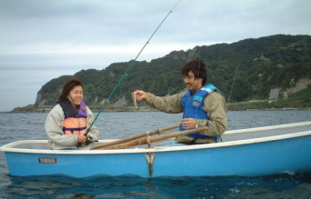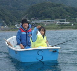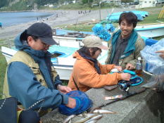 | 4:30AM起床。みんな意外と寝起きが良く、各自そそくさと支度を始める。結局昨夜は1:00AM近くまで小山隊長・Yasと話していたので、とにかく眠い。前日も車の中で仮眠だったし。 5:00AM、民宿のおばちゃんに見送られて出発。外はまだ暗く、寒いけれど、雨は降っていない。セブンイレブンで朝食を買い、対決の場・元名浜へ。 今回の幹事・SAYUKIが貸し舟の段取りをし、ぼくはシットオントップをRから降ろす。本命の釣り部長・Kibunも体調が回復しているようで、軽快な動きを見せている。いよいよ言い訳なしのバトルがスタート。小山隊長&みお、SAYUKI&Kibun、Yas&Keiの貸し舟三艘とぼくのシットオントップが、海へと散る。 万能つり竿セット(時価2000円)に見切りをつけ、Kibunから竿を借りたぼくに、一投目からアタリが。早速釣り上げるとアジが掛かっている。続く二投目にも手ごたえがあり、見事ベラをGet。めちゃくちゃ意気揚々。竿がいいと釣れるものだなぁ。小山隊長&みお、Yas&Keiの敵情を視察・・・というよりも自慢をしに行くと、ちょうどKeiの竿にもアタリが来たようで、記念写真を撮ってあげる。SAYUKI&Kibunはかなり沖のほうまで行っているみたい。名人の称号を得るためにも、頑張らなくっちゃ。 |