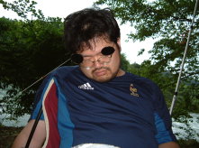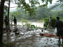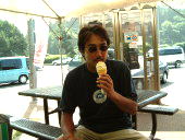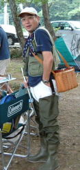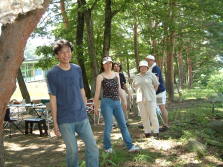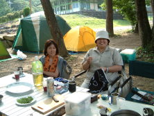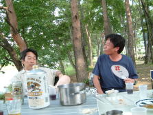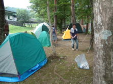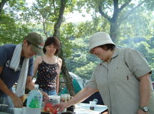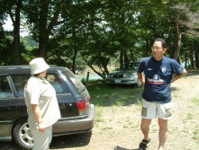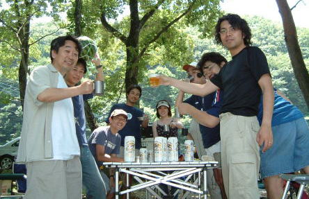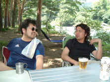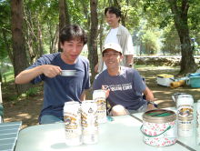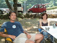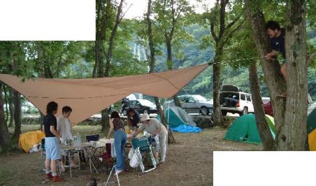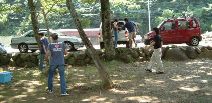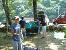 | 一度キャンプ場に入り、管理人にスーパーの場所を確認し、買い物へ。スーパーの前でSAYUKI&Kibunも無事合流し、今回のメンバー9人が勢ぞろい。今日、明日の食料品を買い込んで、再びキャンプ場へ戻る。 今回のキャンプ場・日興リバーランドは川辺のフリーサイトで直火OK、水洗トイレに温泉・テニスコートまで完備されている居心地の良さそうなキャンプ場なのに、ガラガラ。今日から学校は夏休みに入ること、土日のことを考えると、ちょっと信じられない穴場なのだ。キャンプ場の手前に右○団体の合宿所があるからかなぁ・・・。確かに最初はビビったもんなぁ・・・。 とりあえずいつものように設営開始。今回は岡本vsYasの設営時恒例言い争いもなく、すんなりかと思いきや、 「あーっ!また建てられないっ!」 と、うり坊の声。これもいつものことなんだけど、またしてもうり坊、自分のテントを一人で組み立てられないで往生している。 「年に1回しか建てないから、なかなか覚えられないんだよなぁ」 Yasとみーめんが手伝っていると、小山隊長の厳しい一言。 「うり坊、一人で自分のテント組み立てられるようにならなきゃ、奴隷から卒業させないからな」 「えーっ!せっかく年下が二人も入ったのに?」