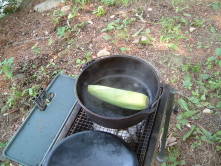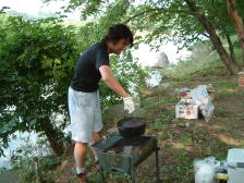 | ビールの酔いが程よくまわってきたところで昼食の準備をはじめる。 「キャンプの昼飯はやっぱそうめんでしょ」 スーパーで献立確認したときはそう言っていたはずなのに、袋を開けるとそこにはひやむぎ。まぁ、きっと誰もその差に気づかないんだろうけど。 何が感動したって、新入隊員で奴隷1号・2号に任命された11郎&みーめんのよく働くこと。その体型が象徴するように、フットワークが軽い。しかも、文句一つ言わない。なんていい奴らなんだ。ぼくらが感心しているのに気がついたのか、初代奴隷(卒業できたの?)うり坊が自慢のダッチオーブンを炭にかけ始めた。 「スーパーで買ったとうもろこし、蒸しちゃおうかな」 やはり、後輩にばかりいいところ見せられたくなかったのかな?蒸しあがったとうもろこしのGoodなお味には、さすが初代奴隷の風格が漂っていたのだ。くや探も若い血が入ることにより、活性化したかな。