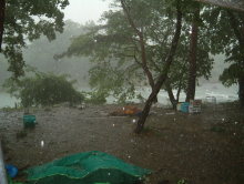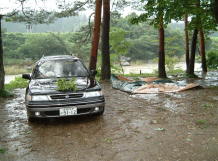 「ダメだ。この川には魚がいない」 釣れなかった言い訳がそれかよと誰もが心の中でツッコんでいたに違いない。でも、それもあながちウソではないことを、ぼくらはこの直後思い知らされることとなる。 「なんか雷、四方から近づいてきていない?」 確かにさっきまでは主に上流から聞こえていた雷の音が、あちこちから、しかも徐々に大きく聞こえている。 「これ、来るね」 すると大粒の雨。濡れたらまずいものをタープの下に入れていると、閃光がひらめき、大きな音が轟く。光の方向に目をやると、対岸の看板に落雷があったようだ。 「すっげーっ!」 風が強くなり、タープが大きくなびく。 「とりあえずタープを畳もうよ」 タープを張っているひもとポールを外していると、手がなんかピリピリする。 「やばいっ!逃げろっ!」 一同クモの子を散らすように、各自車に飛び乗る。風が車体を大きく揺らし、外の光景が滲むほど雨粒が窓をたたく。風が止むのを待ち、窓を開けて外を確かめると、そこにあったはずのテーブルやイス、コンロ類やテントまでもが消えてなくなっていた。 雨は大粒のまま強く降っていたが風は止んだので、表に出て状況を確認する。かなりのものが下流側に飛ばされたようだ。手分けして拾えるものを回収する。軽いもののいくつかは川まで飛ばされて流されたようだ。川の水は増量し、茶色く濁っていた。もしかしたら魚たちはこれを察知し、早々に安全な場所に避難していたのかもしれない。