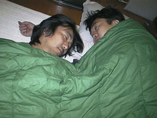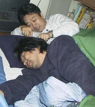 | カラオケBOXを出ると、ENOがYasの自転車でダッシュ!! 「おいおい、大丈夫かよ」 あまりの勢いにYasも心配顔。 「あいつ、俺の家知らないと思うんだよね。」 ENOの影が見えなくなり、残された4人はとぼとぼとホテルYasへ。もうおわかりでしょうが、ホテルYasとはYasの自宅なのだ。 ホテルYasの前にはENOがたたずんでいる。 「ENO、おれんち知ってたの?」 「当たり前でしょ。2回も来たことあるんだから。」 どたどたと男5人が2DKに上がりこむ。それぞれが服を脱ぎ、リラックス態勢へ。はじめから宿泊予定のぼくとやましたはあらかじめ用意してきたスウェット系を、予定調和的とはいえ、急遽宿泊の決まった小山隊長・ENOはYasからスウェットを借りて、ダラ〜っ。 「なに飲みます?」 ホテルのオーナー・Yasからオーダーの要請。一同大酒飲み大会の閉めとして、ワインを選択。'99年を想い、お互いをいたわりつつも乾杯。が、一人死んでるやつがいる。 激動の'99年、隊長の肩にかかっていた重責はそうとうな者だったに違いない。 ご苦労様です。 TVを見ながらワインを飲んでいたんだけど、なにを話していたか、まるで覚えていない。 そして就寝。ところが、照明を消す前に異様な光景がっ。 |