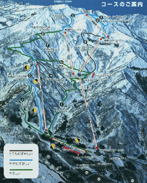 さすがにパウダーは長くは続かず(A・Bコース)、ちょっとアイスバーンっぽい斜面となってしまうけど、緩急メリハリが利いてて、面白かった。風が強く、風にあおられたりして、ちょっぴりドキドキ。 帰りは夏場に車で走った林道を降りてきたんだけど、下るにつれて雪質が悪くなってくる。再び調査位置Dコースを経てFinish! 今回のアフター・ケアにより流した汗は、矢代温泉友楽里館でさっぱり・すっきり。ただし、ここのお風呂は洗い場6席、5人が入ればいっぱいの湯船1つとちょっと手狭だったのだ。 今後も攻撃的アフター・ケアは継続していく予定。'91年3月に調査したGALA湯沢なんてのも、確認しておかなきゃいけないところでしょう。 ああ、なんて仕事熱心なぼくなのでしょうか。 |