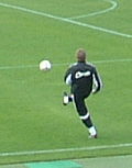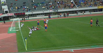 | メンバーもサポーターも興奮覚めやらぬ直後のこと。アルビからボールをカットし、一気にカウンター。アウミールが左サイドを駆け上がりセンターリングしたところに播戸。 ゴール! |