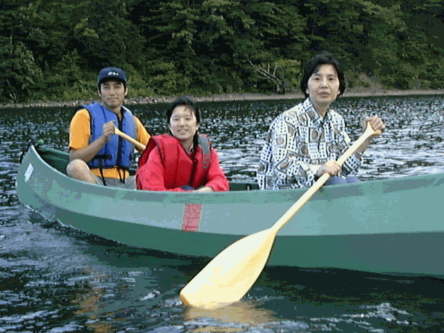 | 街中で暮らしていると、電気がなくなった日のことを思うだけで生きた心地がしないのに、いざ俗世を一歩離れると遊び方は無数にあり、電気なんぞ要らなく思えてしまう。とはいえ、1年中キャンプ暮らしを強いられると拒否するんだけど。 唐突ですが、ここで問題です。Yasのカヌーは何人乗りでしょう。 正解は4人です。でも、男4人だときっと沈むでしょう。いやはや、下の写真を見ると、男2人・女2人でも水位線がかなりあがってます。 |