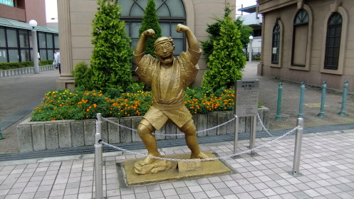 T.亀有駅前集合 ぼくは亀有も柴又も行ったことがない。柴又はさっきも書いたとおり、寅さんの故郷として強いイメージを持っているけど、亀有といえば・・・両さんか。『こち亀』の連載が週刊少年ジャンプで始まったのはぼくが小学生の頃。よく読んでいたけど、亀有が舞台と知ってはいたけど、亀有の町の印象ってあんまりないんだよね。両さんのキャラが濃くって、みんなそっちに持っていかれちゃう。ゆえに亀有といえば両津勘吉かな。 亀有について驚いた。ぼくのそんなイメージを逆手に取るように、亀有駅前は両さんであふれている。両さんで町おこしをしているのだ。黄金の両さん像は、亀有の町を見守るように燦々と輝いている。