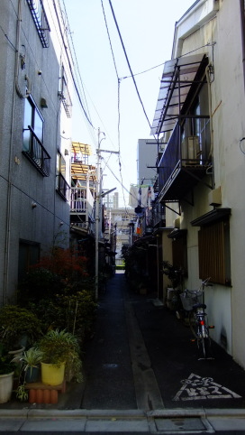 できることなら他の魚も頼んで、このまま腰を据えて飲んでもいいぞって心持ちだったんだけど、店の外にはぼくらの退出を待つ長蛇の列。腹もいい具合にパンパンになったことだし、重い腰上げますか。 店の外に出ると、列はますます長くなっていた。もしかしたらいいタイミングで入ったのかもしれないなぁ。 膨らんだ腹を抱えながら市場場内をぶらついていると、SAYUKIがなにかに反応し、吸い寄せられていく。なにごとぞと思いその先を見ると、そこには色とりどりのイカのストラップが。これは疑似餌なのかな?おいおいSAYUKI、買っちゃうのか?もちろん一番大きいやつだよね。で、春になったらこいつでマグロ釣っちゃうんだよね。 U.築地場内市場〜区立佃公園へ(図中−線) 築地場内市場を出て、場外市場を見て歩く。でもさすが土曜日、観光客であふれかえっている。細い路地に入ろうものなら、身動きできなくなる有様。これではゆっくり買い物もままならないから、実はお店も困ってたりして。 さすが12月。店頭には新巻き鮭がずらりと。そういえばお歳暮に新巻き鮭にのし付けて持ち歩く風習って、『サザエさん』でしか見たことないけど、本当にあるのだろうか?これだけたくさんの新巻き鮭が並んでいるってことは、やはり本当にあるのかも。 築地場外市場から勝鬨橋へ向かう途中で、変わった家を発見。手前に木造の細長い家、奥はブロックつくりの家なんだけど、その間が増築されて連結しているみたい。しかも2軒の屋根をまたぐように新たな部屋ができている。ペントハウス?修ちゃんが住んでる?この家は一体、どんな構造になっているのだろうか。ぜひとも間取り図を見てみたいものだ。