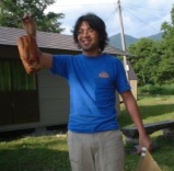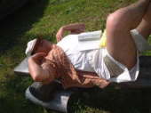 | 曽原湖を一巡りしサイトへ戻ったら、ちょうどうり坊製のベーコンが出来上がり。とりあえず一切れ食べてみるかと、ビールをついで試食会。一番端っこだったのでちょっと塩がきつかったけど、とっても美味。脂身のプルプル感なんて、こっちがトロけてしまいそう。 「どう?成功?」 「大丈夫。いい感じ。」 「このベーコン使って、明日一品作るから。ダッチオーブンで。」 うり坊が作ってくれると言う料理がいまから楽しみ。 「あれ?Kibunは?」 出艇するまでは木製ベンチに寝ていたKibunの姿が見当たらない。するとSAYUKI。 「体調が悪いって、テントで寝てる。貧血気味なんだって。」 「ちがうよ。痔で出血が多いから貧血気味なの。」 そういえばKibun、脱肛組なる新分科会を旗揚げするっていってたっけ。誰も入りそうにないいけれど。 そんなKibunの寝姿です。 |