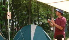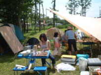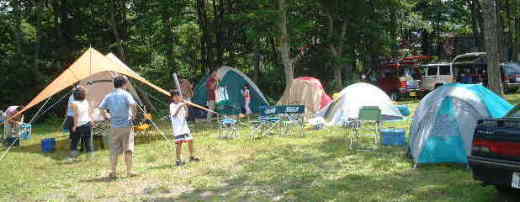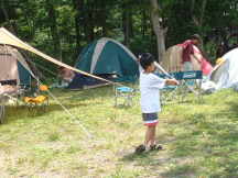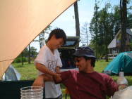| 曽原湖キャンプ場は曽原湖湖畔に位置する。当たり前か。 到着したとき、客はぼくらしかおらず、フリーサイトはまさにフリー。 「場所は何処でも結構です」 と言われると、かえって何処にしたらいいか迷ってしまう。 とりあえず場所を決め、テントを張ることにするが、ここでちょっともめごと。 「おかもっちゃんとYasはとりあえずもめないとテントを張れないから。」 とは、小山隊長の弁。状況を詳しく書こうかと思ったんだけど、あまりの馬鹿馬鹿しさにその内容すら忘れてしまった。それにしても、前回さんま焼きキャンプでもぼくたちはもめてたもんなぁ・・・。 「あぁ、また建て方わからないぃ」 うり坊が自分のテントを張ることができず、YasにSOS。こちらも毎度の恒例行事。 「うり坊も一人でテント張れるようになれば一人前なんだけどなぁ・・・」 |