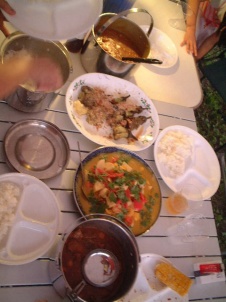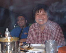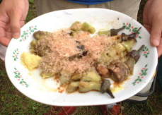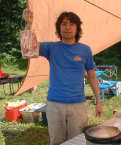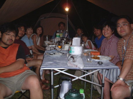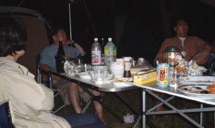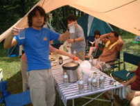 どう?うまそうでしょ。 なによりもYasのタイカレーの彩りの良さ。ふりかけられた香草の緑がアクセントになっている。 小山隊長の乾杯の音頭で宴はスタート。みんな思い思いのカレーやシチューをごはんの脇に盛り付ける。 「あれ?これ、なかなかいけるじゃん。」 予想以上に好評だったのがタイカレー。最初はちょっと癖があるんだけど、薄めたおかげで辛さもほどよく、後を引く味。ついついお変わりをしてしまう。 「そうでしょう、そうでしょう。ちょっと香草がにがいけど、おいしいでしょう。」 作っているときはちょっと不安げだったYasに笑顔が戻る。 「タイカレーは何点ですか?」 「みんなが誉めてくれるから、80点かな。」 終始笑顔のYasなのでした。 |