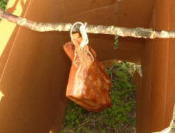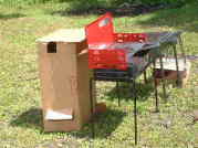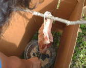 | 肉がいい感じに干さされたら、ダンボールで簡易スモーク器を組み立てましょう。簡易スモーク器の上端から肉をつるしたら、桜のチップを下端で燃やし、煙を充満させて肉を燻します。肉がきつね色に変色し、脂分が程よく落ちるまで、簡易スモーク器のふたは閉めておきます。待つこと○時間で、完成です。 えっ?何時間待つかって? それは個人の好みかなぁ・・・。 |