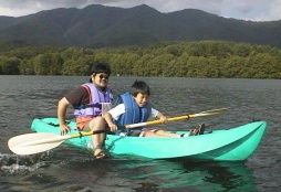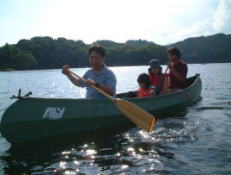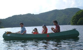 結構でかいぞ。 さとし&みおはすっかり気に入ったらしく、触ったり追い立てたり、楽しげに遊んでいるぞ。 カエルは喜んでいるのか逃げ惑っているのか、辿り着いたのはYasのカヌーの脇。 「おれのカヌーにカエルを入れるのはやめてくれぇ!」 |