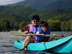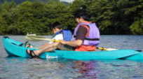 | 「さとし、ぼくの船に乗るか。」 さとしを誘っていよいよ曽原湖へ出艇。しかし、ぼくのシットオントップは一人乗りようで、これまでに2人乗って漕いだことがない。どうなることかと思いながら漕ぎ出したんだけど、結構安定していたのでホっ。 さすがに2人分の重みの影響があるようで、シットオントップはいつもよりも沈みがち。というか、沈みかけてないか?おかげで流木に底を擦りやすかったのとその際のバランスの保ち方に難がアリ。まぁ、流木の多い箇所には近寄らないのが賢明でしょうか。それと、漕ぎ手が一人なので、進むのがちょっと大変だったのだ。それにしても、さとしの頭がライフジャケットにめり込んでるような状態。これじゃまるで、R2−D2だよ。 ぼくらの出艇をみて、Yasも出艇を決意。カヌーを組み立ててぼくらを追ってきたのでした。 |