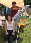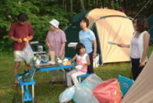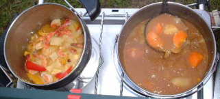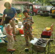 | 日も徐々に傾き、みんな空腹感を覚え始めたので、料理に取り掛かる。 先にも紹介したけれど、この日の料理はYas&みおのカレーとおかあさんのビーフシチュー(調理済み)。付け合せとして各種焼き物を予定。 カレーといえばまずは飯焚き。今回登場するは小山隊長が持参した鍋。どうやら飯焚き専用鍋のようで、 「全体からピチピチ音がしたら炊き上がり」 が売り文句。 小山隊長は火に鍋をかけてからずーっとかたわらでピチピチ音を待ちつづけるも、 「どれがピチピチ音か、わからないや・・・」 一方カレーはというと、Yas&みおが並んで具材をさばいている。周りを囲むはくや探女性陣。2人の手元が気になるようで、つかず離れずサポートしてくれてました。特に主婦の目は厳しいからなぁ・・・。翌日はぼくが監視されるのだけど、それはまだ先のお話。 たまねぎを切るときのお約束といえば、涙。料理初心者のみおちゃんの涙腺に容赦なくたまねぎエキスが襲い掛かる。 小山隊長の言葉にウラ技を思い出すも、 「あっ、ここに冷蔵庫ないからできないよ。」 小学生に絶大な人気と指示を受ける伊東家のウラ技も、文明の力なくばできないものもあるのよね。 たまねぎの威力はとうとうみおちゃんの涙腺をゆるゆるにし、涙かポロポロ。するとみおちゃん、ぼくのところによってきて、 「ねぇ、どうして涙が出ちゃうのかなぁ・・・」 「う〜ん、難しい問題だね。でもね、人は涙見せずに大人になれないんだよ。」 「・・・それって、『TSUMANI』じゃない。」 涙目のみおちゃんに笑みが浮かんだのでした。 クックドゥ・Yasの料理の基本といえば、綿密な下準備とアバウトな調理。今回もタイカレーを作るにあたり、あれこれと調味料を買い揃え、『野外料理の本』なんぞを熟読しながらも、要所は結構アバウト。 鍋から発する強烈な刺激臭と、鍋の中の強い黄色に一同不安を覚え始める。一同を代表して、ご意見番のお母さんが言い放つ。 「全然大丈夫じゃないわよ!」 とりあえず鍋の中の汁をおそるおそる下見。 「かっ、れ〜っ!」 全員一致で味を薄めてから調理再開。Yasちょっと不満顔も(?)、出来上がりの見栄えは美しい。 ちなみに左がYasのタイカレー、右がみおちゃんの甘口カレーです。あなたならどっちを食べる? |