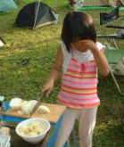 | 今回も楽しくおいしい食事にありついたと満足顔の面々に、 「あっ、デザートできた。」 のYasの声。興味津々のさとしを従えて、フルーツケーキなるデザートを取りにいく。 期待と不安の入り混じる中、アルミホイルを開いてみるとそこにはえもいわれぬ不思議なデザートが。 一同、ちょっとつまんで口にしてみるも、・・・。表現に困る味覚に、言葉が浮かばない。 「なんかちょっと苦いけど、これはグレープフルーツの味だから・・・」 一同が躊躇する中、さとしは果敢にも何度も口にする。 「さとし、気に入ったか?」 「う〜ん、気に入る入らないというよりも、どんな味なのかわからないからわかるまで食べてみてるんだけど、コメントしようのない味なんだよね。」 さとしの辛口批評にYas意気消沈。 「なんかまだ半生って感じだから、味がはっきりしないんだろうなぁ・・・」 この半生感を何にたとえたらよいのやら、みんなで考え抜いた挙句出た答えは、Yasの地元にちなんで、 「ういろうだっ!名付けてトロピカルういろう」 「Yas、何点?」 「・・・30点。でも、一晩置いたら固まっていい味になるよ、きっと・・・」 中禅寺湖キャンプのパエリアの夢をもう一度(こちらを参照)と、トロピカルういろうをラップにくるむYasなのでした。 |