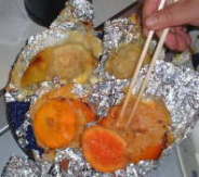 | 付け合せの焼き物はくや探が誇る精鋭部隊・焼き物班が担当。うり坊を頭に、前回大房岬キャンプで焼き物班見習となったさとしとカレー作りがひと段落したみおちゃんが加わり、食材を次々と焼いていく。 SAYUKI持参のとうもろこしは空腹の一時しのぎには最高で、ついつい食べ過ぎてしまうくらい。なすびはしょうがと鰹節を添えて、じつにうまそうな盛り付け。ちなみになすびの皮むき担当はぼくとKunnyでした。 |