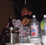 | しっとりとした夜もさらに更けてくると、さとし&みおのくや探Kidsもそろそろおねむの時間。朝早くから出発して、ここまで休むことなく活動を続けていたのだから、無理もないいか。 そこで、2人が寝る前にぼくの用意したデザートをいただくことに。 |