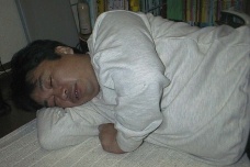 | カラオケBOXを出ると、ENOがYasの自転車でダッシュ!! 「おいおい、大丈夫かよ」 あまりの勢いにYasも心配顔。 「あいつ、俺の家知らないと思うんだよね。」 ENOの影が見えなくなり、残された4人はとぼとぼとホテルYasへ。もうおわかりでしょうが、ホテルYasとはYasの自宅なのだ。 ホテルYasの前にはENOがたたずんでいる。 「ENO、おれんち知ってたの?」 「当たり前でしょ。2回も来たことあるんだから。」 どたどたと男5人が2DKに上がりこむ。それぞれが服を脱ぎ、リラックス態勢へ。はじめから宿泊予定のぼくとやましたはあらかじめ用意してきたスウェット系を、予定調和的とはいえ、急遽宿泊の決まった小山隊長・ENOはYasからスウェットを借りて、ダラ〜っ。 「なに飲みます?」 ホテルのオーナー・Yasからオーダーの要請。一同大酒飲み大会の閉めとして、ワインを選択。'99年を想い、お互いをいたわりつつも乾杯。が、一人死んでるやつがいる。 激動の'99年、隊長の肩にかかっていた重責はそうとうな者だったに違いない。 ご苦労様です。 TVを見ながらワインを飲んでいたんだけど、なにを話していたか、まるで覚えていない。 そして就寝。ところが、照明を消す前に異様な光景がっ。 |
