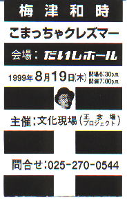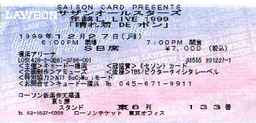 | '99年をサザンで締めれたこと、本当に光栄に思ってる。年に2回もサザンを観れたことも。まさに老若男女が諸人こぞりて、「うぃーっ!!」。2000年も強く生きていけそうな、そんな気にさせてくれる極上のLIVEでした。 |