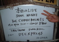 SOULというとSOUL TRAINに代表される腰クネのノリを想像してしまうが、聴いてみるとR&Bに近いのかな。きょうびの若者がやってるようなクラブよりのR&Bではなく、往年のアメリカンブルースの流れをひくR&B。それをコーラスを含め総勢9人編成の面々が気持ちよさそうにやってるのだ。ぼくは評論家ではないので音楽的な詳しいことはよくわからないけれど、気持ちよさそうにPLAYする彼らはとてもかっこよく見えたのだ。ちょっと誉めすぎかな。彼らの気持ちよさにつられて、ぼくも気持ちよくズブロッカをあおってしまい、気分はすごくハイだった。 次ぎやるときも聴きに行くから、その時は教えてくれぃ。 |