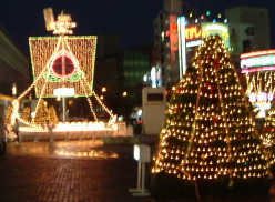 | 岡山に来た。年末まで、クリスマスも寂しく岡山の山の中だ。JR岡山駅に降り立ったら、駅前がクリスマス用(?)にライトアップされていた。メインは桃。岡山らしいよな。