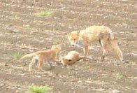 | 北海道の象徴といえばヒグマとキタキツネ。さすがにヒグマは滅多に出くわさないが、キタキツネはちょっとした田舎では良く見かける。ぼくが今いる事務所もちょっとした(かなりの?)田舎にあるため、倉庫の周辺にキタキツネがやってくる。 今日も倉庫の前に1匹のやせた子キツネを発見。あわてて写真を撮り、あとを追うと、裏の畑に親1、子3匹のキタキツネがいるではないか。仲むつまじく寝転んで・・・と思いきや、なんだか様子が変である。なついて寄ってくる子キツネたちに対し、親が攻撃をしているのだ。毛づくろいだと思っていたら、噛んでいるではないか。頼りなく鳴くだけの子キツネたち。それでも甘えに行くってことは、他人のキツネではなさそうだ。 でも、本当に子別れってこの時期だったかなぁ。 |