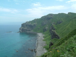| 北海道遠征もラストスパート。このところ体調のせいもあるけど、街遊びばかりだったので、ここはひとつドライブに出よう!候補は富良野と積丹。でも、1日で富良野往復はつらいので、宿泊先京極町からも便利の良い積丹半島をドライブすることに。 ルートは京極町から岩内へ出て、あとは海沿いを北上するだけ。泊原発を左に見ながら、車は海沿いをひた走る。快適。 たいして目的のないドライブだったので、どこに寄りたいとかもなかったんだけど、目の前に神威岬の看板が現れたので、行ってみることに。積丹半島は子供の頃キャンプに来たり、学生の頃ドライブしたけど、神威岬は初めて。 広い駐車場に辿り着くと、観光客でにぎわっている。でも、そこは小高い丘に囲まれて、海はどこにも見当たらない。わけもわからず観光客についていくと、小高い丘の向こうにスネークヘッドのようなやせ尾根が日本海に突き出ている。そう、その先端が真の神威岬なのだ。 病み上がり+増量で重い身体ながら、スネークヘッドの先端を見てみたい。その一念で、裸足にサンダル履きをもいとわずに前進あるのみ。 いやぁ、美しい。先端まで行かずとも、エメラルドブルーの透きとおった海を見るだけで癒される。北海道の野草・エゾカンゾウも黄色い花を咲かせている。あぁ、泳ぎたい。 先端まで到達し、見えた先には通称ロウソク岩。帰り道も素敵な風景。あぁ、このままこの風景に溶け込みたい。あぁ・・・、あぁ・・・