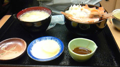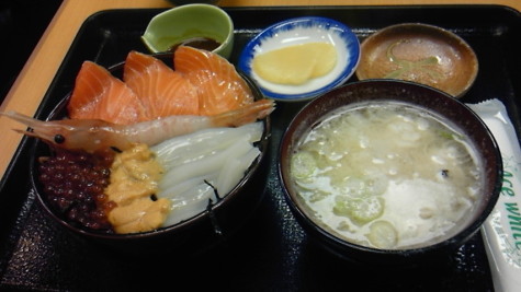 | 越谷オサム「陽だまりの彼女」を読む(11.12.28) 【『artな戯れ言2011』へ移動】 ◇ 一昨日、今年最後の出張ということで、 函館に行ってきた。 今年は函館に行く回数がとても多かった。 前は年に2~3回だったから毎回朝市で丼食べてたけど、 さすがに最近は毎回っていうかあまり行かなくなってきた。 でも、年の最後と言うことで今回は食べてきちゃいました。 朝市の函館駅側に位置する丼横丁では、 東北新幹線新青森駅開業記念55Go!!Go!!キャンペーン実施中で、 各店1,500円の特別メニューを出しているとか。 今回同行したアキラが選んだのは 横丁の一番奥に位置する『あけぼの食堂』。 ここでは3種類の55記念丼を提供している。 ぼくが頼んだのは55記念丼①(1,500円)とたち味噌汁(300円)。 ウニ、エビ、鮭、いくら、イカがドーンと載ってる。 アキラは55記念丼①(1,500円)とたち味噌汁(300円)。 エビ、カニ、ツブ、鮭が載ってる。 年の終わりに豪勢なランチを堪能したのでした。 TOPへ |