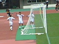 | あきらめムードが満天となった後半35分過ぎ、播戸が再び抜け出してゴール! 播戸、再三のミスを帳消しにする貴重な同点弾。喜べ、喜べ。ぼくもうれしいぞ。 |
