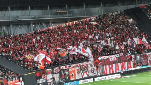 コンサ、J1ホーム2戦目は浦和レッズを迎える。浦和サポーターが大挙して訪れるのに対抗し、観客席には赤と黒の小旗が。まだ観客まばらな客席も、赤黒に染め抜かれているではないか。