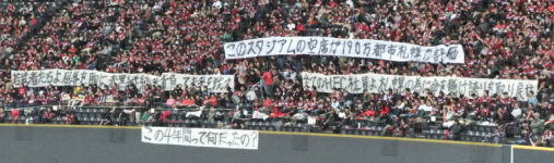 それに較べてコンサの交代陣。純貴、三上、櫛引と、道産子若手でうれしくはあるけど、点を取りに行く、失点を防ぐといったそれぞれの役割はまるで果たせなかった。特に攻撃陣二人、故障明けなどもあるけど、まともにボールを触れなかったのは悔しい。 故障者続出のコンサ、J1残留を目指し獲得した選手のうち、ジェイドと前田以外は怪我で離脱中。待望の初ゴールを決めた前田もけがのため途中退場。心配だ。もし前田の怪我が重傷だったら、ほぼ昨年J2を闘ったメンバーで試合せにゃならなくなっちゃう。選手個人の伸びシロが試されるかも。 今日の観客はJ2時代並み。やっぱり勝てないと客足は伸びない。債務返済のための株主募集が始まったけど、この調子だと厳しいかも。悔しいけど、まだこの産みの苦しみは続くのかな。